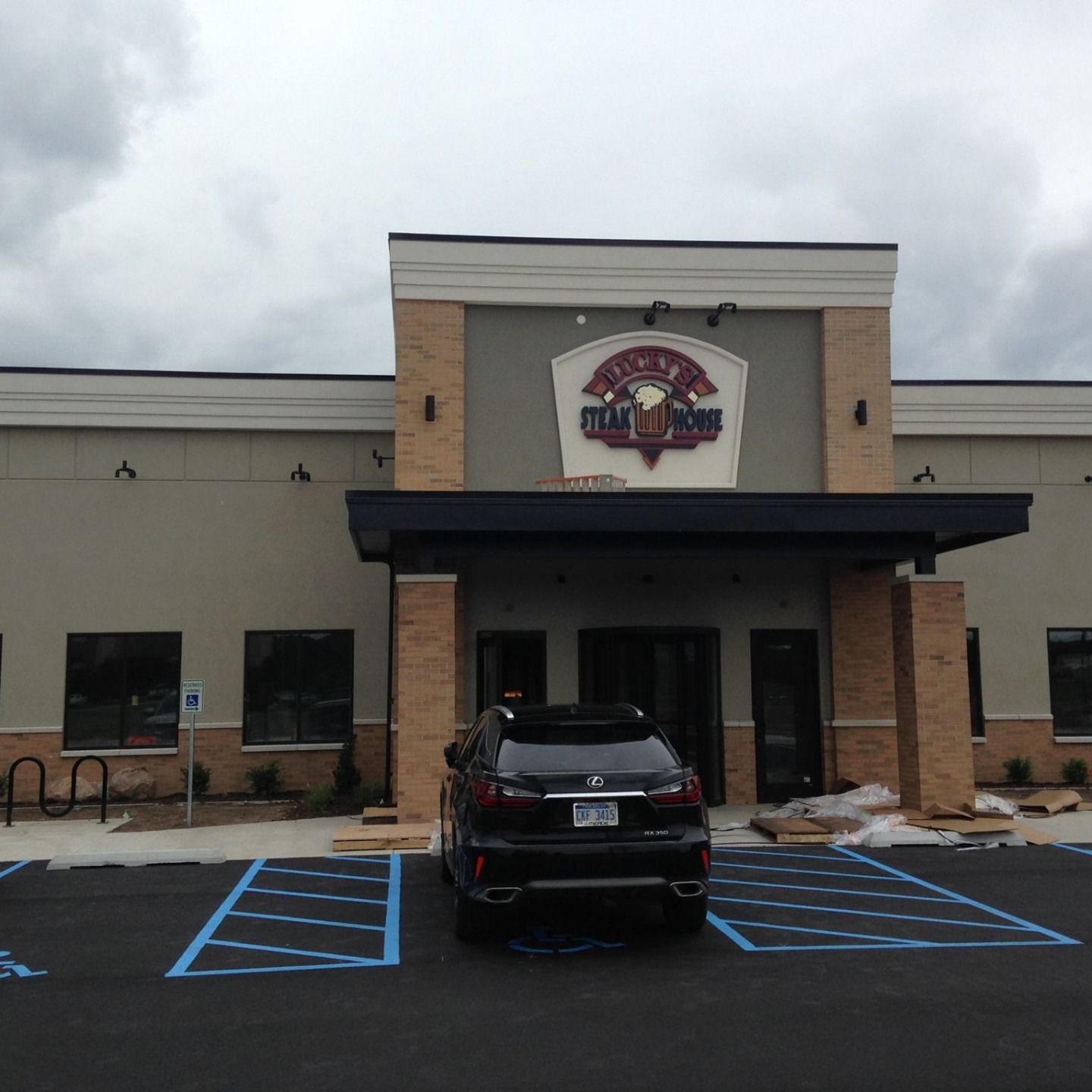 Menu icon: Three horizontal, black lines.